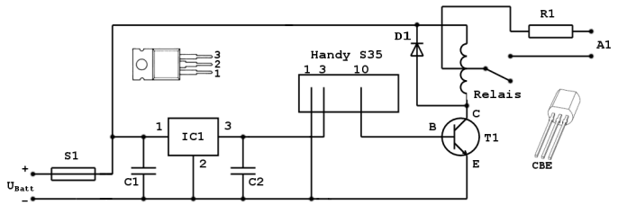 - Je nach dem, was das Handy benötigt, kann man einen passenden Festspannungsregler als IC1 nehmen, der die benötigte Spannung liefert: 7805 für 5V (für das Siemens S35), 7809 für 9V usw. Um den ggf. hohen Ladestrom zu verkraften, wenn das Handy mal eine Zeit lang nicht an der Auto-Batterie war, empfiehlt sich ein 78Sxx, der 2A abkann. Ein kleines Kühlblech ist auf jeden Fall empfehlenswert.
