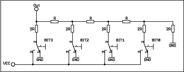 ist falsch. Die unteren Anschlüsse von 2R müssen nach VCC oder nach GND geschaltet werden. Bei dem Schaltersymbol wird VCC aber entweder zum unteren Anschluss von 2R geschaltet und nach GND, womit VCC kurzgeschlossen würde.