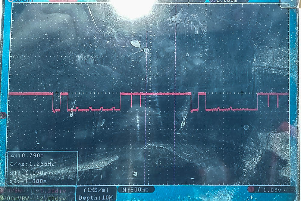 1 Volt in 1X kurz und 1 X lang runter gedrosselt. Dabei antwortet das Motorsteuergerät mit kurzen Impulsen, bis die richtige Baudrate gefunden wurde.