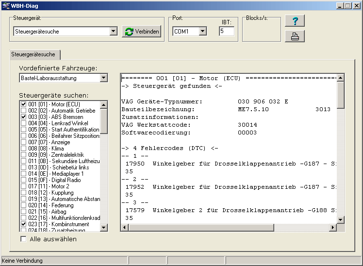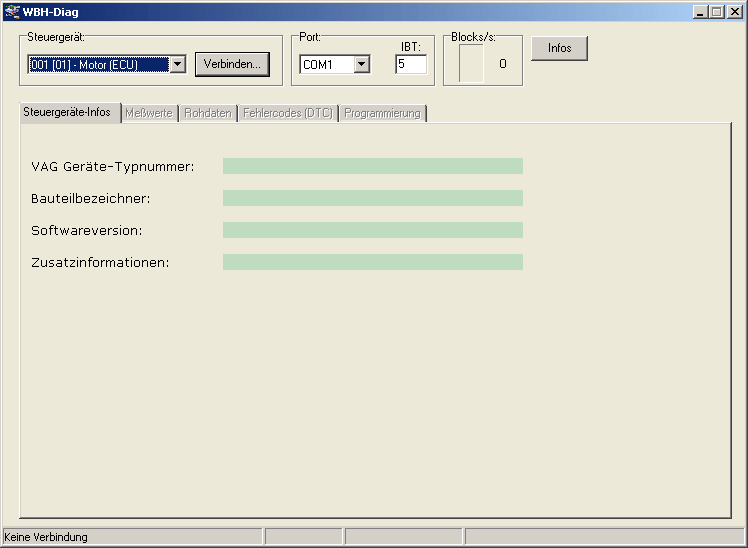 Das Programm ist noch nicht im geringsten ausgereift. Also Pre-Alpha. Deshalb sind auch noch nicht alle Funktionen verfügbar, es gibt Debugausgaben, kein Handbuch usw. Aber eigentlich sollte das Programm schon die Steuergeräte finden und deren Meßwerte auslesen können.