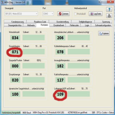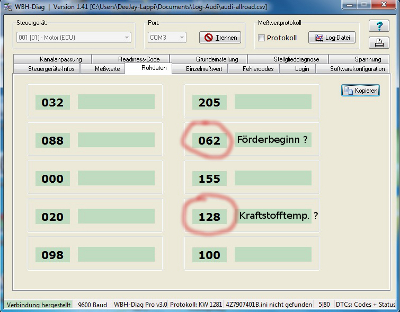 da jetzt die erste Hürde genommen ist und WBH-Diag jetzt korrekte Bezeichnungen und Sollwerte beim auslesen mit anzeigt habe ich jetzt versucht den dynamischen Förderbeginn korrekt einzustellen .....