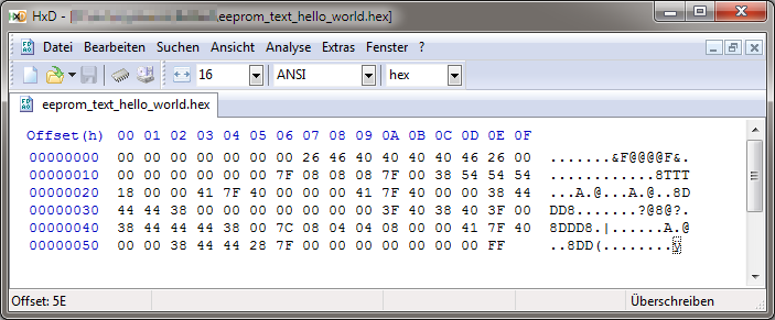 Die notwendigen Bytes können frei ausgedacht werden, um beliebige Grafiken oder Zeichen zu generieren. Es gibt bereits Zeichensätze, in denen die üblichen Zeichen bereits ausgerechnet wurden. Ein solcher Zeichensatz befindet sich im Download mit dem Sourcecode (s. o.) als Textdatei. Um einen Text für das EEPROM vorzubereiten, müssen die Bytes entsprechend den zu leuchtenden LEDs in einer Datei abgespeichert werden. Dazu ist ein Editor notwendig, der Hexwerte editieren und speichern kann. Beispielsweise HxD. In der Abbildung ist ein Smiley und der Text "Hello World" gespeichert. Diese Datei befindet sich ebenfalls im Download und ist standardmäßig installiert, wenn Sie einen vorprogrammierten ATtiny zusammen mit dem Bausatz erwerben. Am Anfang und am Ende sind Leerspalten eingefügt, damit der Text hinein und hinaus läuft.