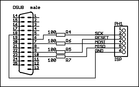 Der Adapter besteht nur aus einem 25-poligen männlichen Sub-D Stecker, der über ein paar Widerständer und etwas Kabel mit einer fünfpoligen Buchsenleiste verbunden ist. Diese Buchsenleiste wird auf die ISP-Pfostenleiste am ATmega gesteckt (Polung beachten, so daß die einzelnen Datenleitungen zueinander passen), wobei der dort vorhandene Pin für +5 V unbenutzt bleibt.