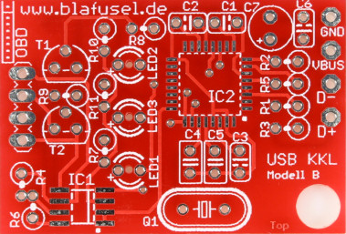 Das neue Modell B bietet im Vergleich zum Vormodell keine elementaren neuen Funktionen. Im wesentlichen unterscheidet sich das Modell B durch den Einbau in einen anderen OBD-2 Stecker von seinem Vormodell. Der neue Stecker ist in einer schwarzen und einer transparent-blauen Ausführung erhältlich. Zusätzlich zeigen nun zwei LEDs (grün/gelb) den Status auf den Datenleitungen zwischen Computer und Diagnosestecker an. Die rote LED leuchtet, wenn der Stecker über den USB-Anschluß mit dem PC verbunden ist (und von dort dann automatisch mit Spannung versorgt wird). Wie auch schon beim seriellen Modell sei angemerkt, daß die LEDs kaum etwas darüber aussagen, ob das Gerät korrekt aufgebaut wurde (s. dort).