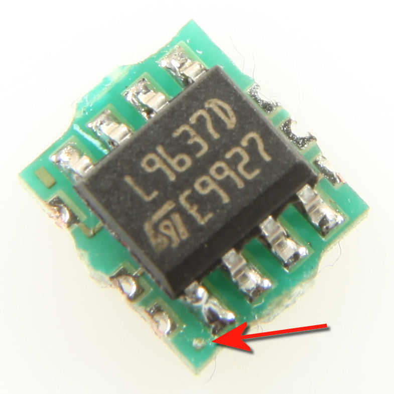 Anschließend sollte der L9637 aufgelötet werden. Da die Abmessungen der Platine sehr klein sind, sollte der Chip sorgfältig platziert werden, damit er mittig auf den Lötflächen sitzt. Der Chip wird wie im Bild gezeigt positioniert: Pin 1 des L9637 wird zu dem kleinen Punkt hin ausgerichtet.