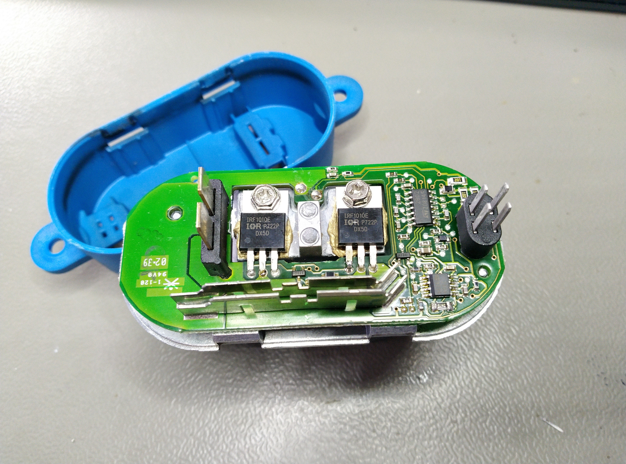 Das Ding arbeitet folgendermaßen: Von der Klima kommt ein Signal entsprechend der gewünschten Lüfterdrehzahl, welches zwei Power-MOSFETs taktet. Dadurch bekommt man eine PWM-Steuerung und kann die Drehzahl des Gebläsemotors in freien Schritten kontrollieren. Das ist technisch besser, weil der Motor dann immer mit Nennspannung betrieben werden kann. Im Prinzip ist es aber noch immer die alte Schaltungsidee und wenn die MOSFETs durchbrennen, bilden sie den gleichen Kurzschluß und der Lüfter läuft permanent. Die MOSFETs müssen einiges an Leistung treiben, was zu so viel Wärme führt, daß sie einen dicken Kühlkörper benötigen und dieser in den Luftstrom der Lüfteranlage ragen muß. Man könnte da vielleicht auch leistungsfähigere Typen einsetzen. In den Kühlkörper ragt ein nicht identifizierbares Bauteil, bei dem ich an einen Temperatursensor denke, der die Schaltung deaktiviert, wenn der Kühler zu heiß wird.