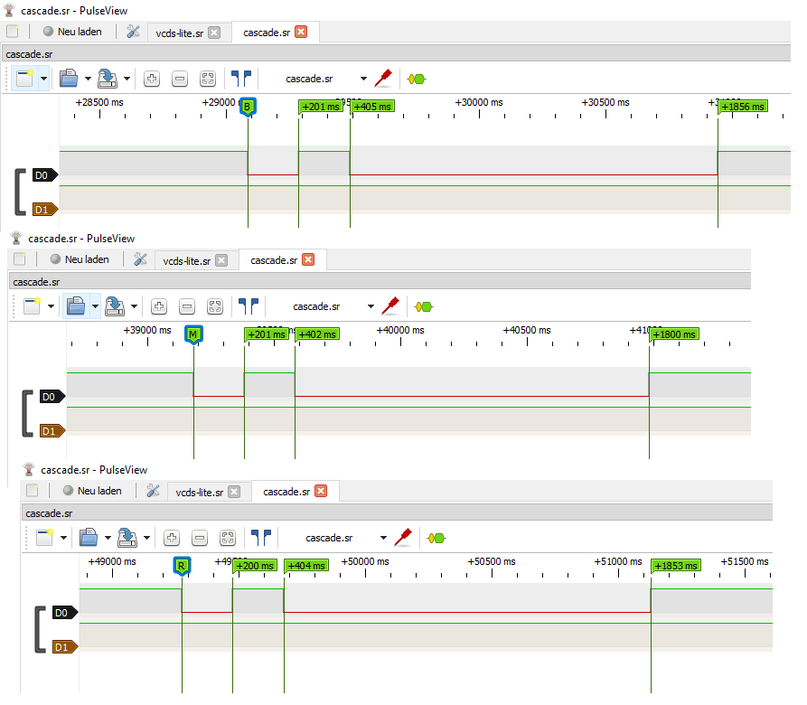 ich hatte mal wieder ein wenig Zeit und konnte mich etwas mit dem Interface beschäftigen. Außerdem habe ich mir einen USB Logic-Analyzer zugelegt, der wirklich Gold wert ist, wenn man kein Speicher-Oszi hat und dem Interface beim Kommunizieren zuschauen möchte. Mit diesem konnte ich den Test, den ich mit dem Röhren Oszi bzw. der LED durchgeführt hatte nun wiederholen und zudem die Zeiten der Initialisierung prüfen.
