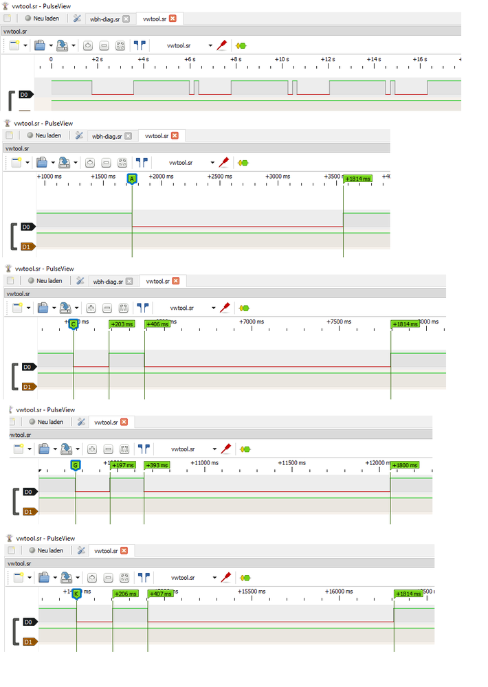 Folgendes (unten in den Bildern dargestellt) konnte ich nachmessen: den Versuch der jeweiligen Software, die Initialisierung durchzuführen. Wie bei den Programmen, die sich mit dem Fahrzeug verbinden zu erwarten war, stimmt die Initialisierungsroutine (größstenteils, ob 4 oder 5ms daneben sind, ist für mich erstmal unwichtig, es ging mir um die Prüfung der Initialisierungssequenz an sich).