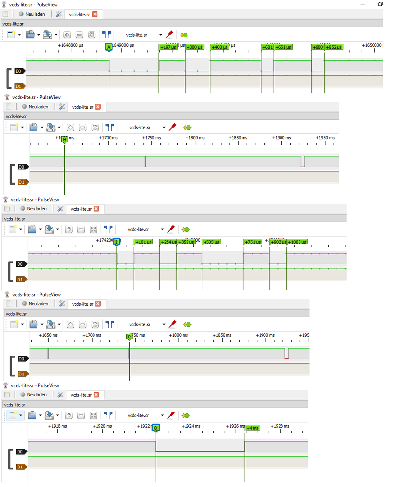 Die Programme, die nicht mit dem Fahrzeug kommunizieren, haben abweichende Ergebnisse geliefert. Bei der Kommunikation mit VCDS-Lite ist zwar ebenfalls eine Sequenz zu erkennen, nur ist diese mit den High Low Sprüngen im µs Bereich zu schnell.