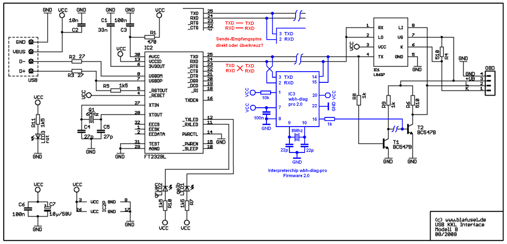 Ich habe den Pro-Chip nachträglich in die Hardware der blafusel USB-KKL Interface Model B eingeflochten, siehe Anlage. Die Kommunikation ist jedoch äußerst instabil. Die Software wbh-diag 1.30 erkennt den verwendeten wbh-diag Pro zwar ohne Probleme und zeigt die Versionsnummer 2.0 des Pro-Chips in der Statusleiste an, und auch das Motorsteuergerät meines Polo wird erkannt, und die VAG Gerätenummer des MSG wird in der Kartei "Steuergeräte-Infos" angezeigt, jedoch erscheint beim Klick auf eine andere Registerkarte der Software, zum Beispiel auf "Fehlercodes" oder "Messwerte", immer die Meldung "Kommunikationsfehler" und die Verbindung zum MSG bricht ab. Änderungen an den Timing-Werten für IBT und BDT in der INI-Datei, wie im Handbuch der wbh-diag Software beschrieben, ändern daran nichts. Nur einige wenige Male hatte ich für ein paar Sekunden Verbindung zu den Fehlercodes und Messwerten.