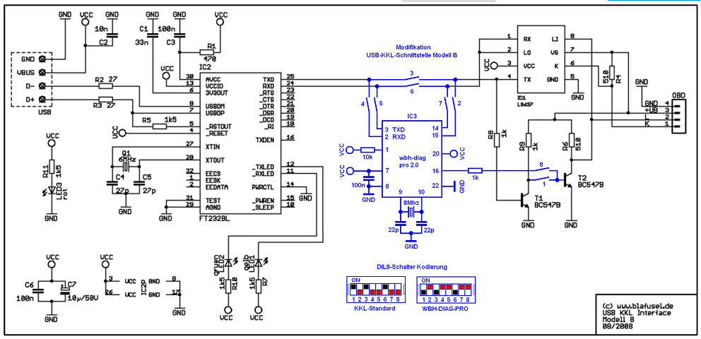Auch wenn der Interpreterchip 2.0 verständlicher Weise nur noch wenige Blicke auf sich zieht, die Modifikation der USB-KKL-Schnittstelle mit diesem Chip funktioniert jetzt. Im Anhang die Schaltung für zwei KKL-Betriebsarten: „Standard“ und „wbhdiag-pro“.