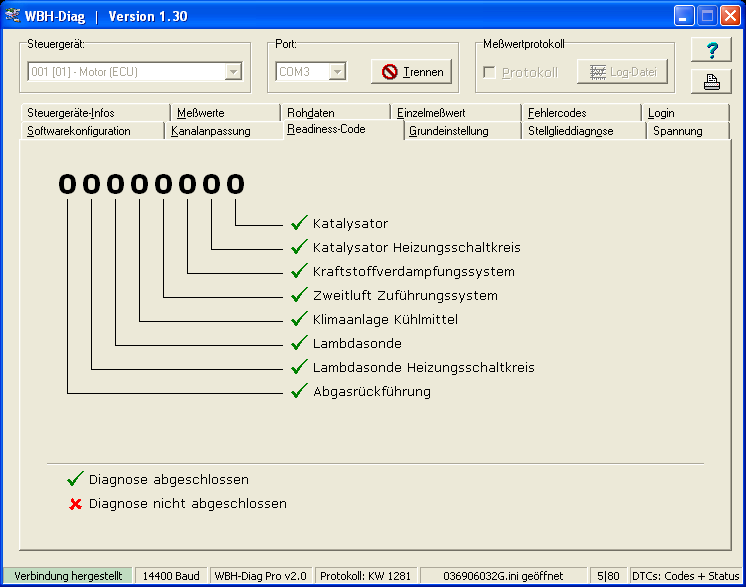 Mit wbhdiag 2.14 komme ich jetzt wie gesagt problemlos in das Motorsteuergerät und die Kommunikation scheint soweit stabil, aber der Readiness-Code wird nicht aufgebaut. Mit wbhdiag 1.30 funktioniert das. Woran könnte das liegen?