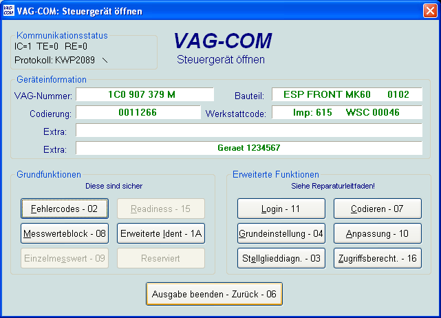 Und in das Bremsensteuergerät (ABS MK60) komme ich weder mit Version 0.89 noch mit 1.30, noch mit 2.14. Die Version 0.89 meldet als Fehler: „KW 2027 Protokoll wird nicht unterstützt“. Die Version 2.14 meldet: „no connection to car“. Die Fehlermeldung von Version 1.30 habe ich vergessen. Testweise habe ich dann mit einer alten Demo von VagCom das gleiche versucht, und damit komme ich zu meiner Überraschung ins ABS-Steuergerät hinein (leider halt ohne die Möglichkeit von Grundeinstellungen, was mir wichtig ist). Jedenfalls scheint VagCom das Protokoll „KWP2089“ zu verwenden für das ABS-Steuergerät.
