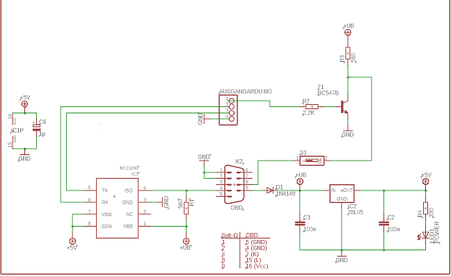 Jetzt möchte ich das Ganze noch unsichtbar verbauen und statt des OBD Steckers ein Interface mit in das Gehäuse des Arduinos verbauen. Ich baue mir also eine Platine, auf der neben dem Arduino auch das Bt Modul und das Interface Platz finden sollen. Ich möchte also 3 Kabel in mein gehäuse führen: 12V Bordspannung, Masse, K Line.
